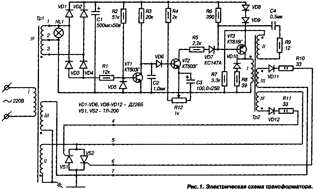 Трансформатор состоит из собственно силового трансформатора Тр1 .регулирующих тиристоров VS1 и VS2, включенных в цепь силовой обмотки II, и блока электронной регулировки, вырабатывающего управляющие импульсы. Дополнительная обмотка III стабилизирует горение дуги и позволяет улучшить процесс ее образования в начальный момент сварки. Обмотка IV питает блок электронной регулировки тока. Трансформатор Тр1 изготовлен на основе статорного сердечника асинхронного двигателя переменного тока мощностью 15, 18,5 или 22 кВт. Двигатель разбирают, и статор вместе с обмотками извлекают из корпуса. В случае затруднений при извлечении статора из корпуса, последний разбивают, конечно, с соблюдением необходимых предосторожностей. Обмотки статора вырубают зубилом и остатки удаляют, не повреждая, однако, сами статорные пластины. После этого магнитопровод обматывают несколькими слоями стеклоткани или киперной ленты. В последнем случае изолирующий материал промазывают эпоксидным клеем или же простым масляным лаком, например, марки ПФ-231. Первичная обмотка I трансформатора выполняется проводом марки ПЭВ-2 (медный) или АПСО (алюминиевый) 02,5 мм и содержит 220 витков. Провод наматывается равномерно по всему сечению магнитопровода. Если провода требуемого диаметра нет, то можно обмотку выполнить двумя проводами, при этом их суммарное сечение должно составлять 5 кв.мм. Для удобства намотки используется челнок, на который предварительно отматывается требуемое количество провода. После изготовления обмотки 1 ее изолируют 2-3 слоями стеклоткани или киперной ленты. Затем рекомендуется проверить ее на наличие короткозамкнутых витков. Для этого обмотку включают в сеть переменного тока напряжением 220 В. Ток в цепи обмотки не должен превышать 0,3-0,5 А. Если значение тока превышает указанное, то ничего не остается, как более аккуратно перемотать обмотку. Вторичную обмотку II выполняют проводом сечением 35 мм кв., она содержит 60 витков. В качестве провода может служить медная или алюминиевая шина с надежной изоляцией. Рядом с обмоткой II на магнитопроводе размещают обмотку III, которая также содержит 60 витков провода марки ПЭВ-2 02,5 мм. Обмотка IV содержит 40 витков провода марки ВЭВ-2 0 0,7 мм с отводом от середины. Обмотки II, III, IV изолируются, как и обмотка I. После окончательной намотки следует снова испытать трансформатор на холостом ходу. При указанном ранее токе на обмотках II и III должно быть напряжение 60 В, а на обмотке IV - 40 В. В основе блока электронной регулировки тока лежит схема аналогичного устройства промышленного изготовления, а именно, трансформатора ТС-200. Монтажная схема регулятора выполняется печатным или навесным способом, но в любом случае регулятор должен быть заключен в надежный корпус. Трансформатор Тр2 наматывается на магнитопроводе Ш16 с толщиной набора 16 мм. Его обмотка 1 содержит 140 витков провода марки ПЭВ-2 00,5 мм, обмотка II - 70 витков провода ПЭВ-2 00,1 мм, обмотки III и IV содержат по 90 витков провода ПЭВ-2 00,5 мм. Резисторы R1 -9- типа МЛТ-0,5; R10, R11 - типа МЛТ-2; RI2 - типа СП2-6А. Конденсаторы С1 и C3 - типа К-50-6; С2 и С4 - типа К73. Блок, собранный без ошибок и из исправных деталей, в наладке не нуждается. Следует обратить внимание на правильное подсоединение обмоток трансформатора Тр2 и на соблюдение указанной в схеме полярности. Работу блока можно проверить с помощью осциллограф