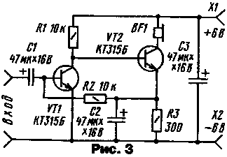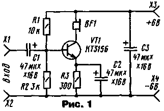 ЭНЦИКЛОПЕДИЯ РАДИОЭЛЕКТРОНИКИ И ЭЛЕКТРОТЕХНИКИ Конструкции И. Бакомчева. Энциклопедия радиоэлектроники и электротехники Энциклопедия радиоэлектроники и электротехники / Начинающему радиолюбителю Однокаскадный усилитель ЗЧ (рис. 1) Это простейшая конструкция, которая позволяет продемонстрировать усилительные способности транзистора. Правда, коэффициент усиления по напряжению невелик - он не превышает 6, поэтому сфера применения такого устройства ограничена. Тем не менее его можно подключить, скажем, к детекторному радиоприемнику (он должен быть нагружен на резистор 10 кОм) и с помощью головного телефона BF1 прослушивать передачи местной радиостанции. Усиливаемый сигнал поступает на входные гнезда Х1, Х2, а напряжение питания (как и во всех остальных конструкциях этого автора, оно составляет 6 В - четыре гальванических элемента напряжением по 1,5 В, соединенных последовательно) подается на гнезда Х3, Х4. Делитель R1 R2 задает напряжение смещения на базе транзистора, а резистор R3 обеспечивает обратную связь по току, что способствует температурной стабилизации работы усилителя. Как происходит стабилизация? Предположим, что под воздействием температуры увеличился ток коллектора транзистора. Соответственно увеличится падение напряжения на резисторе R3. В итоге уменьшится ток эмиттера, а значит, и ток коллектора - он достигнет первоначального значения. Нагрузка усилительного каскада - головной телефон сопротивлением 60...100 Ом. Проверить работу усилителя несложно, нужно коснуться входного гнезда Х1, например, пинцетом - в телефоне должно прослушиваться слабое жужжание, как результат наводки переменного тока. Ток коллектора транзистора составляет около 3 мА. Двухкаскадный усилитель ЗЧ на транзисторах разной структуры (рис. 2) Он выполнен с непосредственной связью между каскадами и глубокой отрицательной обратной связью по постоянному току, что делает его режим независящим от температуры окружающей среды. Основа температурной стабилизации - резистор R4, "работающий" аналогично резистору R3 в предыдущей конструкции. Усилитель более "чувствительный" по сравнению с однокаскадным - коэффициент усиления по напряжению достигает 20. На входные гнезда можно подавать переменное напряжение амплитудой не более 30 мВ, иначе возникнут искажения, прослушиваемые в головном телефоне. Проверяют усилитель, прикоснувшись пинцетом (или просто пальцем) входного гнезда Х1 - в телефоне раздастся громкий звук. Усилитель потребляет ток около 8 мА. Эту конструкцию можно использовать для усиления слабых сигналов, например, от микрофона. И конечно, он позволит значительно усилить сигнал ЗЧ, снимаемый с нагрузки детекторного приемника. Двухкаскадный усилитель ЗЧ на транзисторах одинаковой структуры (рис. 3) Здесь также использована непосредственная связь между каскадами, но стабилизация режима работы несколько отличается от предыдущих конструкций. Допустим, что ток коллектора транзистора VT1 уменьшился. Падение напряжения на этом транзисторе увеличится, что приведет к увеличению напряжения на резисторе R3, включенном в цепи эмиттера транзистора VT2. Благодаря связи транзисторов через резистор R2, увеличится ток базы входного транзистора, что приведет к увеличению его тока коллектора. В итоге первоначальное изменение тока коллектора этого транзистора буде