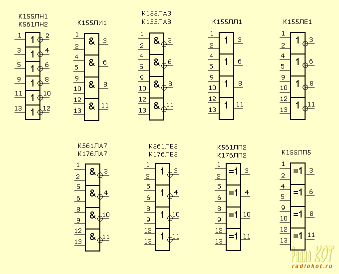 Ну и напоследок - несколько микросхем, внутри которых содержатся цифровые элементы. Около выводов элементов обозначены номера соответствующих ног микросхемы. Все микросхемы, перечисленные здесь, имеют 14 ног. Питание подается на ножки 7 (-) и 14 (+). Напряжение питания - смотри в таблице в предыдущем параграфе.