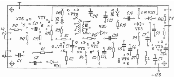 Переменное напряженнее частотой 50 Гц поступает на формирователь импульсов, выполненный на транзисторах VT6 и VT7. Транзистор VT6 образует каскад усиления по напряжению. Как только амплитуда синхронизирующего напряжения превышает определенный уровень, транзистор входит в режим насыщения и запирается, т. е. работает одновременно в двух режимах - усилительном и ключевом. Затем через дифференцирующую цепочку из конденсатора С11 и резистора R13 напряжение синхронизации поступает на базу транзистора VТ7, который формирует кадровые синхроимпульсы по телевизионному стандарту. Строчные синхроимпульсы вырабатывает транзисторный блокинг-генератор на транзисторе VТ8 с индуктивной положительной обратной связью. Пилообразная форма строчных синхроимпульсов получается за счет периодического процесса заряда-разряда конденсатора С13, включенного в цепь обмотки II блокинг-трансформатора Т1. С нее строчные синхроимпульсы через резистор R19 и конденсатор С15 поступают на базу транзистора VT3. Исследуемый сигнал усиливается каскадами на транзисторах VT1, VТ2 и VТ3. Большой коэффициент усиления этих каскадов определяется номиналами резистора R3 и конденсатора С3, которые включены в цепь положительной обратной связи. Периодически меняющееся напряжение исследуемого сигнала управляет яркостью засвечиваемых строк - как бы моделируя строчные синхроимпульсы. Транзистор VТ4 включен по схеме эмиттерного повторителя и работает как усилитель тока. Полный сигнал телевизионного изображения, сформированный приставкой, поступает на вход УКВ-генератора, собранного на транзисторе VT5, который моделирует его по частоте. Выходной сигнал приставки снимается с делителя напряжения из резисторов R9 и R10. При указанных на схеме номиналах деталей этот УКВ-генератор работает в диапазоне частот второго телевизионного канала метровых волн. Схема самой приставки монтируется на печатной плате фольгированного по одной стороне текстолита или гетинакса. Расположение печатных проводников показано на рисунке 2, а радиодеталей на плате - на рисунке 3.