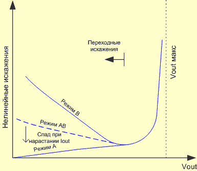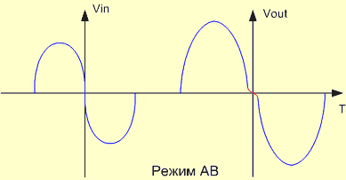 В общем, смешивая эти два способа построения выходных каскадов, мы добиваемся существенного снижения нелинейных искажений с одной стороны (см. картинку) при вполне приличных мощностях и КПД с другой. Большинство современных бытовых усилителей работают именно в этом классе, а уж что касается интегральных усилителей, то есть микросхем, так и вообще все. Правда, за одним исключением, о котором чуть ниже. А пока, давайте подытожим, что мы имеем с этими тремя классами.