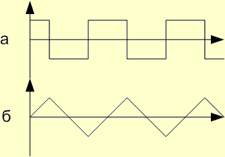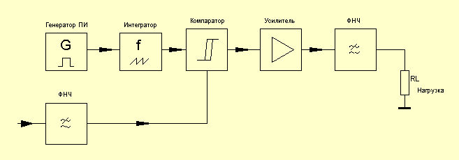 Итак, класс А - отличная линейность, практически полное отсутствие нелинейных искажений, но абсолютно невыносимые мощностные характеристики, особенно в части потребления и тепловыделения. Короче - хотите печку, сделайте выходной каскад класса А. Класс В - мало ест, очень мало. Но при этом так крючит выходной сигнал, что уж лучше бы вообще ничего не делал. Класс АВ - компромиссное решение между двумя предыдущими классами. Взято все лучшее от одного и другого. Вроде всех устраивает по соотношению цена/качество, за исключением, конечно, страшных людей - аудиофилов. Те предпочитают погорячее. Разумеется, этими тремя классами дело не ограничивается - есть, например, такие экзотические режимы как А+ или G, но мы их рассматривать не будем, ввиду их чрезвычайно малой распространенности. Особо любопытствующие товарищи могут поковырять носом литературу или Интернет. Ну а мы поскачем дальше, пока Кот спит. Все рассмотренные выше усилители являлись линейными усилителями, не смотря на все вольности в обращении с вверенным им сигналом. То есть, эти схемы не предусматривают намеренного искажения входного сигнала перед его усилением. Теперь же мы рассмотрим класс усилителей, который специально коверкает входной сигнал, а после усиления восстанавливает его до первоначальной формы. Это класс D. (Мяяяяу! Классный класс!) От же ж, Кота разбудили. Вообще говоря - класс D - это не только схема построения или режим работы выходного каскада - это целый отдельный класс усилителей. Но уж раз Кот проболтался о нем, то придется упихать все это в разговор о выходных каскадах. Для начала, рассмотрим общую структурную схему усилителя. Пробежимся быстренько по блокам, обезображенным на рисунке. Генератор ПИ - генератор прямоугольных импульсов выдает прямоугольные импульсы с фиксированной частотой Fs (график а), которые поступают на интегратор, где преобразуются в треугольные или пилообразные импульсы (график б), после чего поступают на один из входов компаратора.