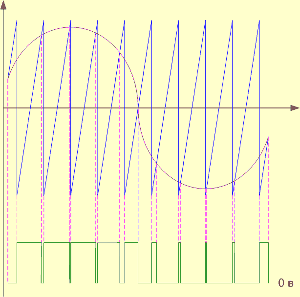 На другой вход компаратора поступает входной аудио сигнал от источника. Вот тут то и начинается главная мясорубка под названием ШИМ (широтно-импульсная модуляция) или PWM (pulse-width modulation) если по-буржуйски. Остановимся подробнее на работе компаратора, для чего посмотрим на картинку.
