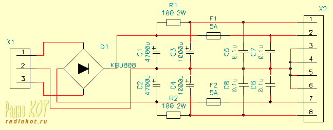 На контактах 2-3-7 обычное питание, так сказать, "±" (плюс-минус). На контактах 1-3-8 то же питание, только ослабленное по мощности. В итоге, если выпрямитель отдает ±30В при токе 5А на контактах 2-3-7, то с контактов 1-3-8 мы не снимем ток, больший 0,3А. Испытывая усилитель таким током, работоспособность его проверить можно, а вот если в схеме есть ошибки, то больше чем в половине случаев можно предотвратить выгорание деталей, сэкономить время и деньги. Если только что собранный усилитель испытывать сразу же на полной мощности, ошибки в схеме приведут к различного рода пиротехническим эффектам, выжиганию транзисторов и еще туевой хуче проблем.