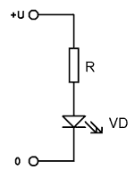 Так как светодиод является полупроводниковым прибором, то при включении в цепь необходимо соблюдать полярность. Светодиод имеет два вывода, один из которых катод ("минус"), а другой - анод ("плюс").