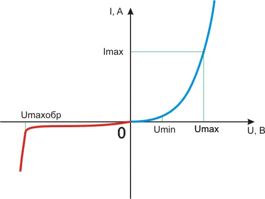 Зависимости тока от напряжения при прямом (синяя кривая) и обратном (красная кривая) включениях показаны на следующем рисунке. Не трудно определить, что каждому значению напряжения соответствует своя величина тока, протекающего через диод. Чем выше напряжение, тем выше значение тока (и тем выше яркость). Для каждого светодиода существуют допустимые значения напряжения питания Umax и Umaxобр (соответственно для прямого и обратного включений). При подаче напряжений свыше этих значений наступает электрический пробой, в результате которого светодиод выходит из строя. Существует и минимальное значение напряжения питания Umin, при котором наблюдается свечение светодиода. Диапазон питающих напряжений между Umin и Umax называется "рабочей" зоной, так как именно здесь обеспечивается работа светодиода.