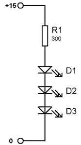Имеются светодиоды с рабочим напряжением 3 вольта и рабочим током 20 мА. Надо подключить 3 светодиода к источнику 15 вольт.