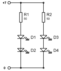 Производим расчет: 4 светодиода на 3 вольта = 12 вольт, значит нам не хватит напряжения для последовательного подключения светодиодов, поэтому будем подключать их последовательно-параллельно. Разделим их на две группы по 2 светодиода. Теперь надо сделать расчет токоограничивающих резисторов. Аналогично предыдущим пунктам делаем расчет токоограничительных резисторов для каждой ветви.