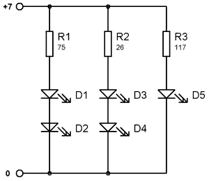 Пусть имеются светодиоды с рабочим напряжением 3 вольта и рабочим током 20 мА. Надо подключить 4 светодиода к источнику 7 вольт