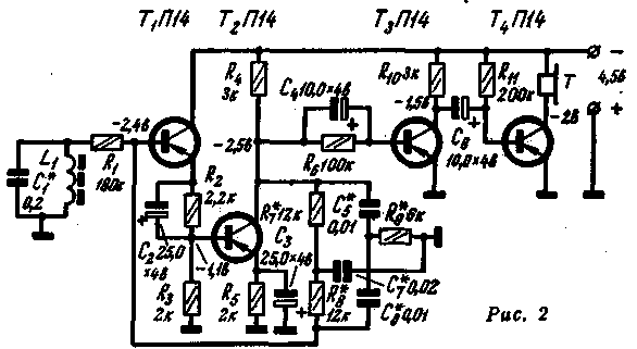 Каскад на транзисторе Т2 (П14) является буферным между генератором и мощным двухтактным выходным каскадом, собранным на транзисторах Т3, Т4 (П201). Сопротивление R2 создает необходимый начальный режим транзистору Т2 по току; сопротивление R3 служит для понижения напряжения питания, подаваемого на первые два маломощные транзисторы в целях предохранения от перегрузок по предельно допустимым параметрам (особенно при работе с модуляцией). Сопротивления R4, R5, создают необходимый начальный режим транзисторам выходного каскада с целью максимального их использования по неискаженной отдаваемой мощности. Секционированная обмотка выходного трансформатора позволяет согласовать выход генератора с нагрузкой в 1- 2 ома, 50 ом и 200 ом. Выходная мощность генератора составляет 5-8 Вт. При необходимости повышения мощности генератора выходные транзисторы можно заменить на П4, а между транзистором Т2 и выходным каскадом добавить один каскад, собранный по схеме с общим эмиттером на транзисторе П201. Принципиальная схема приемника с магнитной антенной представлена на рис. 2.