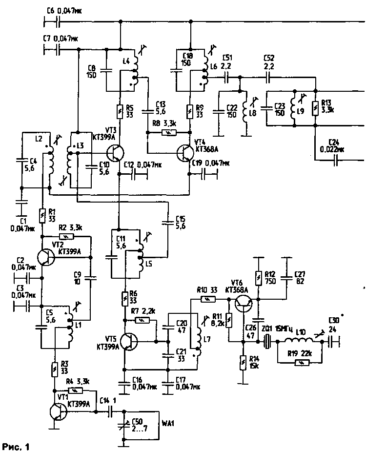 Нажатием кнопки SA2 убеждаются в работе прерывистого тонального генератора. Катушка L12 служит для окончательного сопряжения между собой приемника и передатчика. Теперь переходят к настройке приемника. Отключают экономайзер и систему шумопонижения выключателями SA3 и SA1 соответственно. Включают питание. На резистор R26 подают НЧ-сигнал величиной 50 мВ и частотой 1 кГц, и добиваются чистого неискаженного тона в динамической головке В1. Движок резистора R26 должен находиться в положении максимальной громкости. Далее на вывод 18 микросхемы DA1 подают ВЧ-напряжение с частотой 9 МГц, амплитудой 100 мкВ и девиацией 3 кГц. Вращением сердечников катушек L9 и L11 добиваются максимальной громкости в динамической головке В1. Затем такое же напряжение, но величиной 10 мкВ, подают на базу транзистора VT3, и настраивают контуры L4, С8; L6, С18 и L8, С22 по максимуму громкости. При этом нелинейные искажения должны отсутствовать. Гетеродин приемника настраивают так же как задающий генератор передатчика, т.к. схемы у них аналогичны. Теперь подают напряжение с частотой 144 МГц, величиной 10 мкВ с девиацией 3 кГц на базу транзистора VT1. Вращением соответствующих сердечников настраивают контуры L1, С5; L2, С4 и L3, С10 В резонанс. При этом уменьшают входное напряжение до величины 0,3 мкВ. Затем производят сопряжение приемника и передатчика по частоте вращением сердечников катушек - L1 приемника и L2 передатчика, а также подстраивают рамочную антенну вращением ротора конденсатора С50 по максимуму чувствительности приемника. Она должна быть не хуже 5 мкВ/м при отношении сигнал/шум 20 дБ. Далее включают систему шумопонижения выключателем SA1, и на максимуме чувствительности добиваются четкого ее срабатывания вращением движка резистора R16. Далее выключателем SA2 включают экономайзер и проверяют его работу. На этом настройка приемника и всей системы в целом заканчивается. Описанная система многократно повторялась и хорошо себя зарекомендовала. По вопросу приобретения чертежей печатных плат просьба обращаться к автору, вложив конверт с обратным адресом. Литература 1. В.Стасенко. Барьерный режим работы транзистора. - Радиолюбитель, 1996, №1. Автор: В.Стасенко (RA3QEJ), Воронежская обл., г.Россошь; Публикация: Н. Большаков, rf.atnn.ru