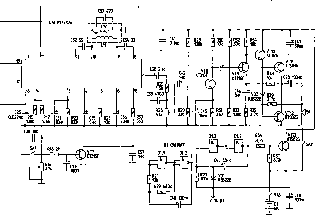 ЭНЦИКЛОПЕДИЯ РАДИОЭЛЕКТРОНИКИ И ЭЛЕКТРОТЕХНИКИ Универсальное устройство оповещения. Энциклопедия радиоэлектроники и электротехники Энциклопедия радиоэлектроники и электротехники / Охранные устройства и сигнализация объектов Описываемое в статье устройство оповещения представляет собой радиоканал с односторонней передачей информации. Оно может быть использовано в различных сферах деятельности. Например, в качестве радиоохранного устройства различных объектов. Его можно установить в комнате спящего ребенка или больного человека, у обычного телефона или у звонка двери квартиры, а с радиоприемником находиться в радиусе до 5 км. Так как передатчик имеет голосовое управление, от речи говорящего, шума или других звуков он перейдет в режим передачи. Устройство можно использовать и как радиомикрофон или как систему персонального радиовызова для дома. Если приемник будет находиться у гуляющего во дворе ребенка, его всегда можно позвать, воспользовавшись кнопкой вызова или голосом. Это устройство может быть использовано и в радиоуправлении различными объектами. Дополнив передатчик и приемник шифратором и дешифратором команд соответственно, можно значительно расширить сферу применения данного устройства. Подобные устройства уже давно выпускаются многими зарубежными фирмами, но в отечественной литературе оно описывается впервые. В устройстве использована узкополосная частотная модуляция с девиацией 2,5 кГц, очень чувствительный приемник (с чувствительностью 5 мкВ/м на встроенную рамочную антенну) и радиопередатчик мощностью не более 10 мВт. Устройство не содержит дефицитной элементной базы, очень просто в настройке и может быть повторено даже начинающими радиолюбителями. Рассмотрим работу устройства. Принципиальная схема радиоприемника приведена на рис.1. Он построен по схеме супергетеродина с одним преобразованием частоты. Принятый сигнал поступает в рамочную антенну WA1. Она настраивается в резонанс конденсатором С50 на частоту 144 МГц. Рамочные антенны предпочтительнее для носимых радиоприемников, т.к. они не подвержены влиянию окружающих предметов, а при длине периметра рамки меньше длины волны ее направленные свойства почти не сказываются на работе приемника. С антенны сигнал поступает на двухкаскадный усилитель высокой частоты, построенный на транзисторах VT1 и VT2 типа КТ399А, работающих в барьерном режиме. Контуры L1, С5; L2, С4 и L3, С10 также настроены на частоту 144 МГц. Сюда же подается напряжение гетеродина частотой 135 МГц с отвода катушки L5 через конденсатор С15. Транзистор смесителя также работает в барьерном режиме. Нагрузкой смесителя служит контур L4, С8, настроенный на частоту 9 МГц. Она является промежуточной. С отвода катушки L4 сигнал ПЧ подается на усилитель промежуточной частоты на транзисторе VT4 типа КТ368А. Он также работает в барьерном режиме. Нагрузкой УПЧ служит ФСС на элементах L6, С18, С51, L8, С22, С52, L9, С23. С катушки L9 сигнал ПЧ подается на микросхему DA1 типа К174ХА6 для дальнейшего усиления и детектирования. Опорный контур частотного детектора микросхемы DA1 L12, C3З настроен на частоту 9 МГц. Выключатель SA1 служит для отключения системы шу-мопонижения. С вывода 7 микросхемы DA1 сигнал НЧ поступает на усилитель низкой частоты, выполненный на транзисторах VT8...VT12. Выходной каскад УНЧ работает в режиме В. Его общий ток 