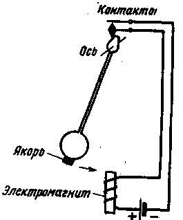 ЭНЦИКЛОПЕДИЯ РАДИОЭЛЕКТРОНИКИ И ЭЛЕКТРОТЕХНИКИ Часы на транзисторе. Энциклопедия радиоэлектроники и электротехники Энциклопедия радиоэлектроники и электротехники / Часы, таймеры, реле, коммутаторы нагрузки Основный элементом обычных механических часов является маятник или баланс, которые приводятся в движение гирей или пружиной. Такие часы требуют регулярного и частого подзавода, что создает определенные неудобства. Многие конструкторы долгое время работали над проблемой создания часов без гири и пружины, в результате появились электромеханические часы. В них маятник приводится в движение электромагнитом, который питается от источника электрического тока. Когда маятник приближается к положению равновесия (рис. 1), контакты, связанные с ним, замыкаются, и по обмотке электромагнита протекает ток. На маятнике укреплен якорь из мягкого железа, который притягивается неподвижным электромагнитом.