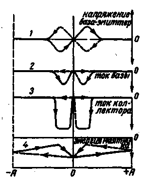 Центр маятника (магнита) пересекает ось катушки в положении равновесия. При колебаниях маятника в катушке L1 наводится эдс, форма которой иллюстрируется кривой 1 (рис. 3). На этом рисунке кривые, проведенные сплошной чертой, представляют эпюры напряжений и токов, возникающих при движении маятника слева направо, а пунктиром - справа налево. Концы обмотки катушки L1 включены так, что, когда маятник подходит к положению равновесия, на базе транзистора появляется отрицательное относительно эмиттера напряжение. Оно возникает при приближении магнита к катушке, вследствие увеличения магнитного потока, пересекающего ее витки. В положении равновесия магнитный поток через катушку достигает максимума. В этот момент напряжение становится равным нулю. Далее магнитный поток начинает уменьшаться и эдс меняет знак на обратный. Когда магнит отходит далеко от катушки, напряжение на ее концах почти исчезает. Во время второго полупериода картина повторяется: при приближении магнита к катушке в обмотке L1 наводится такая эдс, что на базе напряжение отрицательно. Под действием этого импульса напряжения в цепи базы проходит ток (кривая 2) и транзистор отпирается (рис. 3).