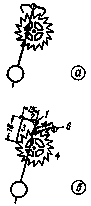 Направление витков катушки L2, включенной в цепь коллектора, таково, что, когда по ней проходит ток коллектора (кривая 3) магнит притягивается к катушке. Его движение ускоряется. Частота колебаний маятника как и в обычных часах почти полностью определяется его физическими параметрами: длиной и распределением массы. Масса маятника в основном определяется магнитом и деталями его крепления. С маятником связывают стрелочный механизм с циферблатом, и часы готовы. Конструкция часов. Для изготовления часов на транзисторе вполне пригодны любые маятниковые часы или "ходики". В них необходимо лишь переделать спусковое устройство и, конечно, удалить пружину или гирю; их функции будет выполнять батарея. В обычных часах спусковое устройство, приводящее в движение маятник, имеет вид, показанный на рис. 4,а. Его надо переделать так, как показано на рис. 4,б. На ось 1 напаивают коромысло 2, на котором свободно подвешена серьга 3. При движении маятника влево серьга скользит по скошенной стороне зубца храпового колеса 4 и под действием своей тяжести соскакивает с его вершины в промежуток между зубцами. При движении маятника вправо серьга упирается в крутую сторону зубца и поворачивает храповое колесо влево на один зуб. Чтобы зафиксировать положение колеса и не дать ему поворачиваться вправо, на нем сверху лежит одним краем лепесток-собачка 5. Второй край лепестка свободно поворачивается вокруг оси 6. При вращении храпового колеса влево лепесток скользит по скошенным краям зубцов и, соскакивая с их вершин, упирается в крутые края зубцов.