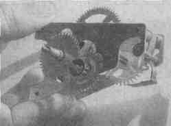 Собранный механизм часов, изготовленных из обычных "ходиков", показан на рис. 5. Коромысло, серьга и лепесток-собачка в этих часах изготовлены из жести. Магнит может быть использован любой. Его объем не должен быть менее 3-4 см3, так как он должен удерживать груз 100-200 г. В описываемой конструкции использован кольцевой магнит от громкоговорителя диаметром 35 мм. Для регулировки хода часов крепление магнита должно предусматривать его перемещение вверх и вниз. Если часы спешат, то маятник (магнит) необходимо опустить.