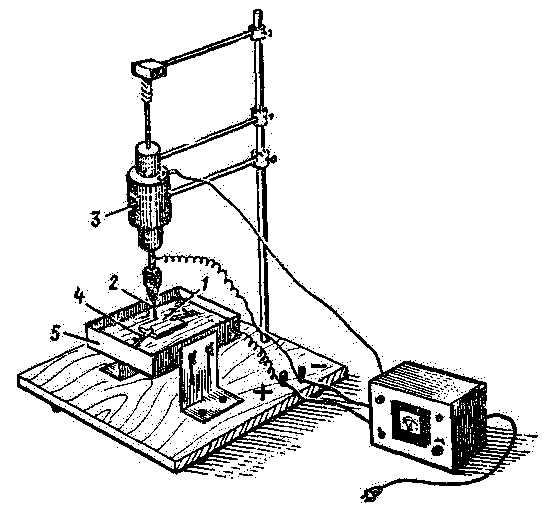 Простая электроискровая установка (рис.1) позволяет легко и быстро обрабатывать небольшие детали из электропроводящих материалов любой твердости. С ее помощью можно получать сквозные отверстия любой формы, извлекать сломавшийся резьбовой инструмент, прорезать тонкие щели, гравировать, затачивать инструмент и др.