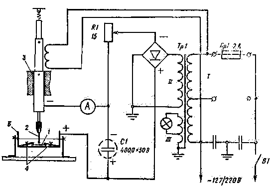 Принципиальная электрическая схема установки изображена на рис.2. Работает установка следующим образом. Разрядный конденсатор С1 соединен своим плюсовым выводом с обрабатываемой деталью 1. Минус его подключен к инструменту 2. Электромагнитный вибратор 3 сообщает инструменту непрерывные колебания. Этим обеспечивается постоянное искрение в месте контакта и предотвращается возможность сварки инструмента с деталью. Обрабатываемая деталь 1 закреплена в зажимном устройстве 4, которое имеет надежный электрический контакт с ванночкой 5.