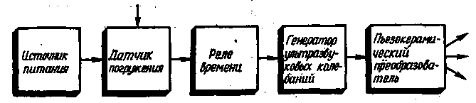 ЭНЦИКЛОПЕДИЯ РАДИОЭЛЕКТРОНИКИ И ЭЛЕКТРОТЕХНИКИ Гидроакустический сигнализатор. Энциклопедия радиоэлектроники и электротехники Энциклопедия радиоэлектроники и электротехники / Электроника в быту Несмотря на широкоразветвленную сеть спасательной службы на водоемах, все же встречаются несчастные случаи, вызванные обычно нарушением правил поведения на воде. Одной из основных задач, стоящих перед спасателями, является своевременное оказание помощи пострадавшим. От того, как быстро будет найден человек, терпящий бедствие, или только что утонувший, зависит спасут его или нет. В статье приводится описание комплекта приборов, предназначенных для сигнализации о тонущем пловце. Такой комплект необходим при проведении работ, связанных с кратковременным погружением на небольшую глубину без акваланга. Гидроакустический сигнализатор незаменим во время соревнований ныряльщиков на длительность пребывания под водой. Сама идея сигнализации с помощью радиотехнических средств о чрезмерно длительном, а следовательно опасном для жизни, пребывания под водой заслуживает внимания радиолюбителей. Датчик, реагирующий на длительное пребывание на глубине 1-2 м под водой не универсален, так как несчастный случай может произойти на меньшей глубине. Следовало бы сконструировать датчик, реагирующий на прекращение дыхания или сердцебиения. Много еще нерешенных задач в области применения электроники для подводного плавания, и, в частности, для создания надежной связи под водой. Здесь открывается простор для творчества радиолюбителей, которые должны помочь спасателям в их благородном и трудном деле. Гидроакустическая аппаратура автоматической сигнализации о тонущем человеке состоит из малогабаритных автоматических передатчиков и одного "дежурного" приемника. Передатчики закрепляются на теле пловцов, а приемник находится на спасательном посту непосредственно у воды. При приеме сигналов бедствия от любого из передатчиков на спасательном посту автоматически включается световая и звуковая тревожная сигнализация. Дальность действия аппаратуры порядка 200 м. Передатчик Передатчик, блок-схема которого помещена на рис. 1, а принципиальная схема - на рис. 2, состоит из датчика погружения, реле времени и генератора ультразвуковых колебаний с пьезокерамическим излучателем. Рабочая частота передатчика 53 кГц.