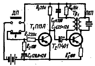 Примечания: 1. Режимы транзисторов даны при Uвх=1-2 мкв. После этого настраивают усилитель ВЧ. Для чего отключают гетеродин и на вход приемника от генератора стандартных сигналов через конденсатор емкостью 0,05- 0,1 мкф подают немодулированные колебания с частотой 53 кГц; усиленное напряжение высокой частоты измеряется ламповым вольтметром на коллекторе транзистора Т3. При выключении сигнала с входа приемника вольтметр должен показывать напряжение собственных шумов приемника. Величина этих шумов, приведенная к входу, не должна превышать 0,01 мкв для настроенного приемника (при закороченном входе). Если при выключении сигнала вольтметр показывает напряжение, значительно превышающее уровень шумов, то это указывает на возбуждение в каскадах усиления ВЧ. Для устранения этого следует несколько разнести друг от друга трансформаторы Тр2 и Тр3, в ряде случаев помогает смена концов вторичных обмоток этих трансформаторов. Затем необходимо настроить в резонанс контуры трансформаторов Tp1, Tp2 и Тр3 изменением величин конденсаторов С3 и C8 или подбором чисел витков первичных обмоток. В последнюю очередь производится настройка контура, образованного гидроакустическим преобразователем и первичной обмоткой трансформатора Tp1. В этом случае сигнал на входе приемника воспринимается непосредственно преобразователем ПКП от катушки индуктивности, включенной на выходе ГСС и установленной на расстоянии 10- 15 см от ПКП. На катушку индуктивности с ГСС подается сигнал напряжением около 1 в. Настройка входного контура в резонанс достигается изменением числа витков обмотки I или подключением параллельно контуру конденсаторов. Резонанс определяется по максимальному показанию вольтметра. Чувствительность приемника после настройки входного контура должна повыситься в 1,5-2 раза. Подключенный к схеме гетеродин настраивается по частотомеру на частоту 51-51,5 кГц изменением числа витков обмотки I трансформатора Tp5 и подстроечным сердечником. Работа смесителя и усилителя НЧ проверяется при подаче на вход приемника частоты 53 кГц от ГСС. Наибольшее усиление и лучшая передача низкочастотных сигналов достигается подбором смещения на базе транзистора Т4 с помощью сопротивлений R10 и R12. Реле P1 исполнительной части приемника должно срабатывать при напряжении на базе транзистора Т6 минус 0,1-0,2 в, ток коллектора в этом случае равен 0,15-0,2 мА; при установке электромагнитных реле с более низкоомными обмотками коллекторный ток может увеличиваться до 8-10 мА. После настройки передатчика и приемника в отдельности проверяется работа всей аппаратуры в воде. Авторы: А.Давыдов, Б.Давыдов; Публикация: Н. Большаков, rf.atnn.ru