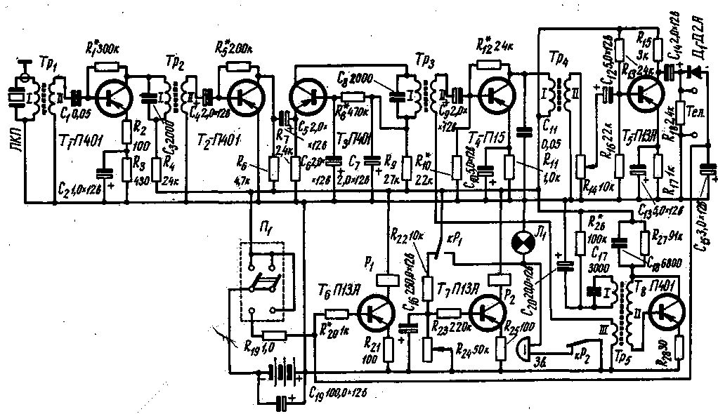 Диаметр верхней площадки равен 10 мм. Сверху на крышку и опорный штифт клеем 88 приклеена эластичная резина (2) толщиной 0,2-0,3 мм. При погружении передатчика на глубину 0,2-0,5 м опорный штифт под давлением воды, перемещаясь до упора в ограничитель, производит переключение контактов. Регулировка датчика глубины производится с помощью груза, равного силе давления столба воды высотой в 0,2-0,5 м (около 40 г). Частота генерации определяется индуктивностью первичной обмотки трансформатора Тр1и емкостью пьезокерамического преобразователя. Настройка передатчика производится по частотомеру на резонансную частоту преобразователя изменением числа витков первичной обмотки трансформатора. Настройка передатчика посредством подсоединения параллельно преобразователю добавочного конденсатора нежелательна, так как это приводит к бесполезной потере выходной мощности передатчика. Выдержка реле времени регулируется изменением величины емкости конденсатора C1. Вопрос наиболее рационального размещения передатчика на купающемся человеке имеет немаловажное значение как с точки зрения нежелательной экранировки сигналов передатчика телом человека, так и с точки зрения обеспечения свободы движений пловца в воде. Как показал опыт, наиболее удобным вариантом размещения передатчика на купающемся человеке следует считать крепление на плавательной шапочке, -в специально предусмотренном резиновом "кармане". В связи с небольшим весом (50 г на воздухе и 22 г в воде) такой способ крепления не вызывает неудобств. Приемник Распространяющиеся от передатчика по воде ультразвуковые колебания воспринимаются пьезокерамическим преобразователем, усиливаются приемно-усилительным трактом и осуществляют включение тревожной сигнализации. Принципиальная схема приемника приведена на рис. 3. Он собран на восьми транзисторах по своеобразной супергетеродинной схеме с заземленным эмиттером и предназначен для работы на фиксированной частоте 53 кГц. Номинальное напряжение питания - 15 в (четыре батареи КБС-Л-0,5); при снижении напряжения питания до 11 В работоспособность приемника полностью сохраняется. Рис. 3. Конденсатор С17 должен быть соединен с коллектором транзистора Т8. Потребляемый ток в дежурном режиме порядка 17-20 ма; в режиме включения предварительного индикатора около 105 ма и в режиме работы тревожной сигнализации - не более 300 ма. Коэффициент усиления приемника по напряжению равен 6-9-105. Чувствительность, определяемая минимальной величиной сигнала на базе первого транзистора, при котором срабатывает реле P1, равна 1 мкв. Усилитель ВЧ состоит из трех каскадов, собранных на транзисторах T1, T2, T3. Преобразователь ПКП вместе с первичной обмоткой трансформатора Tp1 составляет контур, настроенный в резонанс на частоту 53 кГц. Межкаскадные согласующие трансформаторы Тр2 и Тр3 также являются резонансной нагрузкой и повышают избирательность приемника. Для получения максимального усиления и уменьшения вероятности самовозбуждения каскадов усиления ВЧ второй и третий каскады, собраны по каскодной схеме с параллельным питанием. Усиленные ультразвуковые колебания вместе с частотой гетеродина со вторичной обмотки трансформатора Тр3 поступают на смеситель, собранный на транзисторе Т4. Гетеродин приемника собран на транзисторе T8 по той же схеме, что и генератор передатчик