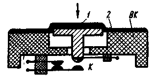 Передатчик смонтирован внутри корпуса пьезокерамического преобразователя на прямоугольной гетинаксовой плате, имеющей размеры 15х22 мм. Транзистор Т2 взят с коэффициентом усиления не менее 60. Трансформатор Tp1 выполнен на ферритовом кольце (Ф-600) с наружным диаметром 8 мм. Обмотки I и II содержат соответственно 70 и 9 витков провода ПЭЛШО 0,17. С целью получения наименьших габаритов конденсатор C1 собран из 12 параллельно соединенных конденсаторов типа ЭМИ 10 мкф 3B. Нижний торец преобразователя (ПКП) клеем 88 закреплен в пазу гетинаксовой фигурной крышки. В корпусе крышки имеется герметизированное отделение для аккумуляторов. Замена аккумуляторов производится через дно крышки, укрепленное на шести винтах. Герметизация дна осуществляется посредством круглой резиновой прокладки сечением 2х2 мм диаметром 20 мм. Схематический чертеж датчика погружения дан на рис. 5. Контактная группа (К) датчика погружения укреплена с внутренней стороны верхней крышки (ВК) преобразователя. Воспринимающим элементом датчика погружения является опорный штифт (1), выполненный в форме грибка.
