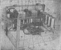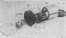 Реле времени исключает возможность подачи ложных сигналов при нырянии купающихся и включает передатчик только через 55-60 сек после срабатывания датчика погружения. Такое время выдержки выбрано исходя из того, что тренированный пловец способен задержать дыхание под водой на время порядка одной минуты: Всякий случай пребывания человека под водой дольше одной минуты может расцениваться как опасный для жизни. Если же в практике и будут встречаться случаи, когда ныряльщик сможет находиться под водой дольше одной минуты, то, во-первых, после подъема пловца на глубину менее границы срабатывания датчика погружения тревожная сигнализация выключится, а, во-вторых, в приемнике имеется дополнительно реле времени, выдержку которого можно регулировать в зависимости от необходимости в широких пределах. Для излучения и приема ультразвуковых колебаний в передатчике и в приемнике применены пьезокерамические преобразователи из титаната бария чувствительностью 3-10 мкв/бар, имеющие форму полого цилиндра с наружным диаметром 30 мм, внутренним диаметром 26 мм и высотой 28 мм. Электроакустический коэффициент полезного действия таких преобразователей порядка 25%. Цилиндрическая форма преобразователей позволяет получить круговую характеристику направленности приемника и передатчика, достаточно же малое отношение высоты преобразователя к длине рабочей волны приближает характеристику направленности к сферической. И все же у преобразователей цилиндрической формы пространственная характеристика излучения (приема) имеет зоны малой интенсивности (чувствительности) сигналов. Хотя вероятность совпадения зон малой интенсивности передатчиков с зоной малой чувствительности приемника невелика, этих зон желательно не иметь совсем. Для получения в пространстве полной сферической и равномерной характеристики излучения (приема) более эффективным будет применение в аппаратуре преобразователей сферической формы. Генератор ультразвуковых колебаний и реле времени выполнены на двух транзисторах T1 и Т2 типа П-13А и П-401. На первом из них собрано реле времени и на втором- собственно генератор. Генератор собран по схеме с индуктивной обратной связью. В качестве источника питания в передатчике используются два аккумулятора типа Д-0,06, соединенные последовательно. При погружении на глубину менее 0,2-0,5 м передатчик электрической энергии не потребляет; при нахождении на большей глубине, когда работает реле времени, потребление тока составляет 4,0 ма. В режиме излучения передатчик потребляет ток 3,0 ма, поэтому практически можно считать, что продолжительность работы источников литания в течение одного цикла определяется временем их саморазряда. Выходная электрическая мощность передатчика составляет 6,0 мВт, акустическая мощность - около 2 мВт. Расположение деталей передатчика изображено на рис 4.