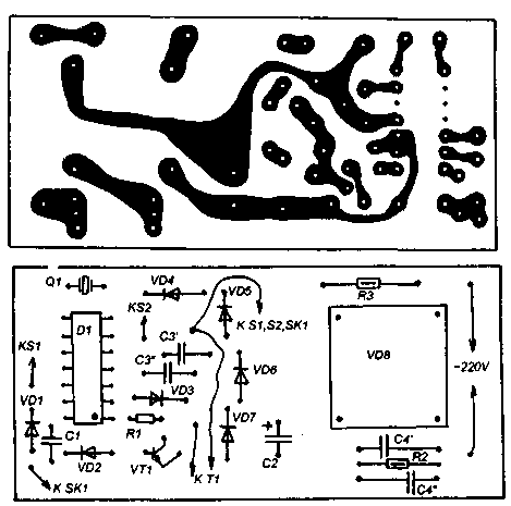 Плата сделана из гетинакса с односторонней фольгировкой. Можно использовать и другой фольгированный изоляционный материал, применяющийся для печатных плат. На плате не размещаются кнопки S1 и S2 (SK1 выводится на входную дверь) и трансформатор. Микросхема может быть УМС-8 или УМС-7, дополнительные цифры (например УМС-8-08) говорят о музыкальном репертуаре микросхемы. Кнопки S1 и S2 располагаются на корпусе звонка, с помощью кнопки S1 можно выбрать мелодию для дальнейшего проигрывания, а кнопкой S2 можно остановить воспроизведение. Конденсаторы С3 и С4 составлены каждый из двух параллельно включенных конденсаторов на 0,33 мкФ каждый, на монтажной схеме они отмечены как C3' C3" и С4' С4". Выпрямительный мост КЦ405А можно заменить мостом, собранным из диодов КД105В или КД209В,Д226. При отсутствии готовой основы можно использовать трансформатор от выходного каскада старого транзисторного приемника и любой динамик на 0,1-3 Вт. Налаживание правильно собранного устройства из исправных деталей заключается в подборе номинала конденсатора С1 таким образом, что бы при нажатии на SK1 происходило полное однократное воспроизведение музыкального фрагмента. Если емкость С1 будет слишком велика автомат может воспроизводить мелодию несколько раз подряд. При необходимости можно подобрать более точно емкость С3, так чтобы тембр и громкость звучания были оптимальными. Литература 1. На микросхемах серии УМС. Радио 12-1995, стр. 40-41. Автор: Каравкин В.; Публикация: Н. Большаков, rf.atnn.ru