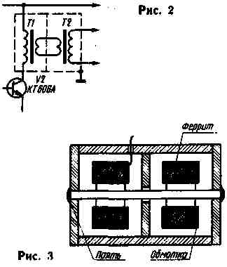 Лучшие результаты могут быть получены при использовании в качестве нагрузки трансформаторов с коротко-замкнутым объемным витком. Схема включения трансформаторов приведена на рис. 2, чертеж трансформаторов - на рис. 3. Связь между их магнитными потоками осуществляется короткозамкнутым объемным витком. выполненным в виде стержня, припаянного к крышкам латунного цилиндра. Каждая из обмоток намотана на сердечнике типоразмера К10х6х3 из феррита марки 1000НМ-9. Обмотка трансформатора Т1 содержит 12 витков провода ПЭВ-2 0,31, трансформа тора Т2 - 5-7 витков провода ПЭВ-2 0,64. Корпус трансформатора соединяют с общим проводом.