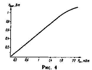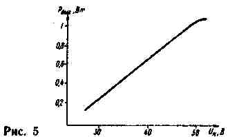 Зависимость выходной мощности от входной для второго усилителя показана на рис. 4, а зависимость максимальной выходной мощности от величины коллекторного напряжения при неизменной входной мощности - на рис. 5. Хорошие результаты были получены при усилении однополосного сигнала.