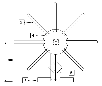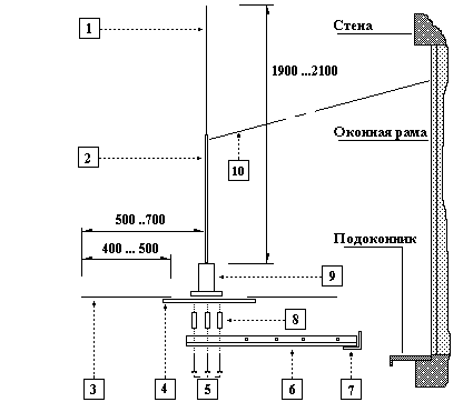 Составной штырь представляет собой металлическую трубку 2 диаметром 7 ... 9 мм ( лучше из меди или дюралюминия ), в которую вставлена стальная проволока диаметром 2.5...4 мм. Такая конструкция позволяет получить высокую механическую прочность и при необходимости легко изменять длину антенны. Блок противовесов выполнен из фольгированного стеклотекстолита ( толщиной 3 .. 4 мм ) в виде круга 4, к которому припаяны проволочные лучи 3. Для их изготовления может быть использована медная проволока диаметром 2 .. 3 мм. Для крепления антенны использована Т-образная штанга (6,7), изготовленная из трех металлических уголков, свинченных винтами. Уголок 7 служит для крепления штанги к нижней доске оконной рамы. Блок противовесов привинчивается к штанге через втулки 8 длинными винтами или шпильками 5. Для придания большей жесткости всей конструкции желательно раскрепить антенный штырь деревянными рейками 10, как это показано на рис . 1. Более подробно следует остановиться на конструкции согласующего устройства, которая показана на рисунке 3. На центральный изолятор ( текстолит, эбонит, и т.п.) диаметром 18 ... 22 мм намотаны катушки автотрансформатора . По его оси вставлены две резьбовые шпильки, которые фиксируются латунными винтами, служащими одновременно площадками для подпайки проводов и антенного кабеля. На верхнюю шпильку либо непосредственно, либо через резьбовую втулку навинчивается штырь антенны, а посредством нижней шпильки согласующее устройство привинчивается к блоку противовесов. Желательно закрыть согласующее устройство сверху каким либо непроводящим кожухом - например, пластмассовым стаканом подходящих размеров.