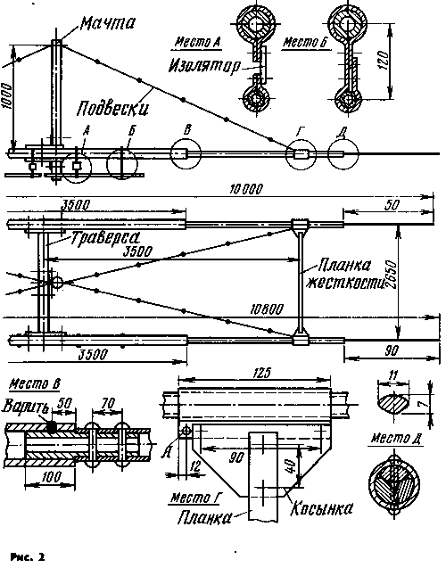 При выбранном расстоянии l/8 между вибраторами наилучшая односторонняя направленность антенны получается тогда, когда ток в заднем вибраторе (рефлекторе) отстает от тока в переднем вибраторе (директоре) на 225°" В другой публикации ([2]) приведены результаты сравнения этой антенны с другими, уже известными. "Коэффициент усиления двухэлементной антенны с обоими активными элементами,- говорится там,- эквивалентен усилению полноразмерной трехэлементной антенны с пассивными директором и рефлектором. При одинаковых значениях коэффициента усиления двухэлементная система легче, проще в конструктивном отношении и обладает меньшим моментом инерции и парусностью Антенна с активным питанием позволяет получить большее подавление излучения назад... Коэффициент усиления у такой антенны на 3,4 дБ выше, чем у антенны с пассивным рефлектором, а максимальное подавление излучения назад составляет 40...50 дБ, в то время как в пассивных системах оно не превышает 25 дБ" Оба автора дают преимущественно сведения об электрических параметрах антенны, что, конечно, важно, но мало рассказывают о ее конструктивном исполнении, надежности в работе. По данным, приведенным в [2], например, получается, что один из элементов на диапазоне 20 м, прикрепленный к траверсе, должен иметь вылет около 5,5 м, свободно расположенный в пространстве Но в сложных метеорологических условиях имеющейся прочности может оказаться недостаточно. Автором данной статьи применены планки, соединяющие элементы и обеспечивающие жесткость конструкции в горизонтальной плоскости. Подвески, поддерживающие элементы, сходятся на мачте выше плоскости антенны. Этим достигнута жесткость по вертикали. Конструкция получилась довольно прочной. Антенна на диапазон 20 м эксплуатируется более четырех лет без ремонта и находится в хорошем состоянии. Она выдержала пыльные бури, гололед, ветры. Схематично часть антенны показана на рис. 1. Размеры ее элементов на разные диапазоны при диаметре труб 30 мм даны в таблице. За исходный размер активного вибратора взят 0,46l, рефлектора - 0,5l. Следует учитывать, что длина элементов зависит от диаметра труб.