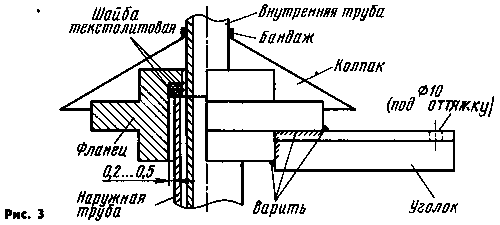 Глубина проточки 30 мм. К фланцу приварены равномерно по окружности три стальных уголка типоразмера 30Х30Х3 мм длиной 300 мм с отверстиями для крепления оттяжек. Применение выступающих уголков уменьшает дополнительное натяжение оттяжек при вращении мачты. Фланец опирается на два текстолитовых (стеклотекстолитовые не годятся!) кольца, которые хорошо удерживают смазку (ЦИАТИМ-201, солидол). Применение здесь шариковых, упорных, роликовых подшипников себя не оправдывает. Конструкция фланца для крепления оттяжек второго яруса аналогична. Этот фланец опирается на стальное кольцо, жестко фиксированное на внутренней трубе мачты. Перед подъемом антенны над фланцами устанавливают защитные колпаки из толи, рубероида или оцинкованного железа. Все места соединения деталей конструкции прокрашивают два раза автомобильной эмалью или суриком.
