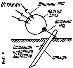 Оттяжки нужно изготовлять из двух-трех скрученных проволок (из оцинкованной стали, меди; стальной трос применять не следует). Однопроволочная оттяжка очень ненадежна. Нижние концы оттяжек крепят к штырю, заложенному в землю, через стальное кольцо диаметром 150...200, шириной 50 и толщиной 4...5 мм (рис. 4). Кольцо может быть изготовлено из полосы, соединенной внахлест. Слишком натягивать оттяжки не следует - это только затруднит поворот антенны, а зимой может привести к их обрыву. В верхней части наружной трубы, отступив 50 мм от края, сверлят три отверстия, расположенных равномерно по окружности, и нарезают резьбу М6. Отступив 0,5...1 м, сверлят еще три таких же отверстия. После подъема внутренней трубы болтами М6 с заточенными на конус концами ее центрируют и надежно фиксируют.
