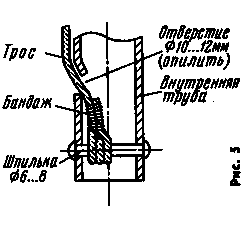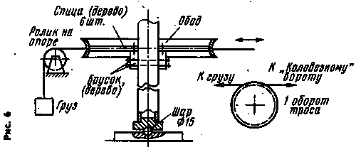Трос для подъема внутренней трубы прикреплен к ее нижнему концу. Конструкция этого узла показана на рис. 5. Перед подъемом трос пропускают через ролик, устанавливаемый на фланце первого яруса растяжек, и фиксируют на простейшем вороте, прикрепляемом к нижней части мачты. По мере выдвижения внутренней трубы перемещают штырь, на который она опирается. Мачта антенны опирается на стальной шар диаметром 15 мм от шарикоподшипника. На наружной трубе в ее нижней части укреплена шестерня диаметром 600 мм (ее сердечник выточен на станке, а венец использован от маховика автомобильного или тракторного двигателя). С помощью простого зубчато-червячного редуктора она соединена с 50-ваттным коллекторным электродвигателем.