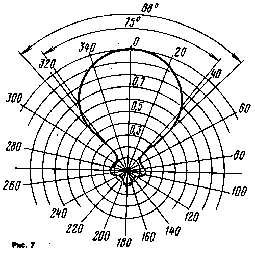 Приводное устройство можно сделать и более простым - на базе обода велосипедного колеса (рис. 6). При настройке антенны ее устанавливают на возможно большей высоте, на открытом месте, но так, чтобы к ней был доступ (чтобы элементы ее находились примерно в трех метрах над землей). В первую очередь, ГИРом определяют резонансную частоту элементов (без согласующих устройств и фазосдвигающих линий). Катушку прибора при этом подносят к середине элемента. Резонансная частота активного вибратора должна быть 14,15 МГц, рефлектора - 14,05 МГц. Если резонансная частота оказалась выше требуемой, необходимо проверить, не коротки ли вибраторы - и при необходимости удлинить их. Если же резонансная частота меньше, то устанавливают согласующее устройство и фазосдвигающую линию. Фидер подключают через жесткую катушку (4-6 витков диаметром 15 мм; остальные ее характеристики некритичны). Поднося к ней ГИР, определяют резонансную частоту всей системы - она не должна превышать 14,15 МГц. После этого добиваются минимального КСВ и оптимального отношения значений излучения вперед и назад. Это можно сделать, используя всего лишь трансивер и индикатор поля. Антенну подключают к трансиверу, и индикатором поля находят максимум излучения по диапазону и направлению. Если он находится в начале диапазона, то элементы длиннее требуемых, если в конце - короче. Установив резонансную частоту, перемещением хомутов на согласующих устройствах добиваются минимума КСВ. Последний этап настройки - снятие диаграммы направленности излучения на рабочей высоте. Оптимальные значения высоты - 0,5l (10,5 м) и l (21 м); на промежуточных - диаграмма направленности может искажаться. Так, при высоте 6 м диаграмма близка к круговой. Индикатор поля располагают на расстоянии 20...50 м от антенны, желательно на той же высоте, что и она. Включают трансивер в телеграфном режиме и, поворачивая антенну, через каждые 15...20° фиксируют показания индикатора. По полученным точкам строят диаграмму (рис. 7).