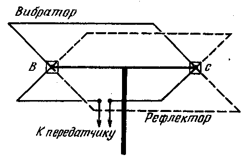 Недостатком антенны следует считать необходимость применения высококачественного изоляционного материала в точках В и С для изоляции элементов вибратора и рефлектора, поскольку в этих точках максимумы напряжения.