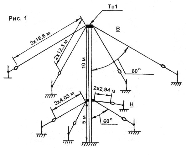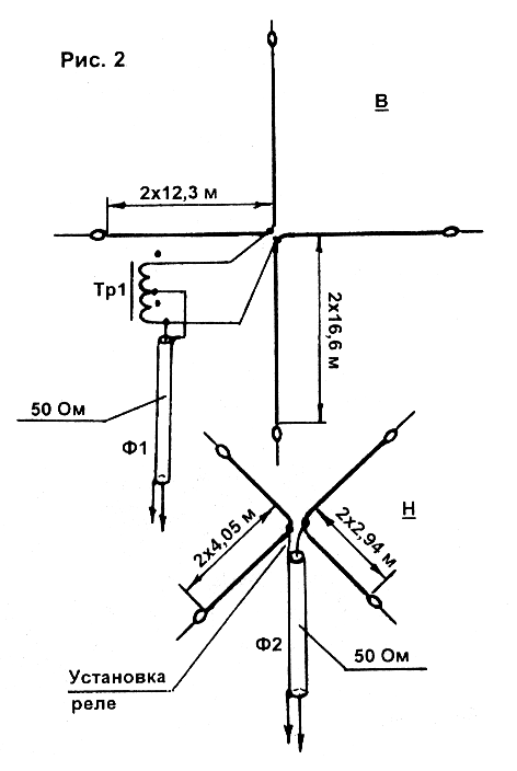 Ïðåäëàãàåòñÿ äâóõúÿðóñíàÿ àíòåííà, ðàáîòàþùàÿ íà 10, 12, 15, 17, 20, 40 80 ìåòðàõ ÊÂ-äèàïàçîíà. Âåðõíèé ÿðóñ (Â) ðàáîòàåò íà 10, 15, 20, 40, 80 ìåòðàõ, íèæíèé ÿðóñ (Í) - íà 12 è 17 ìåòðàõ (ðèñ 1).