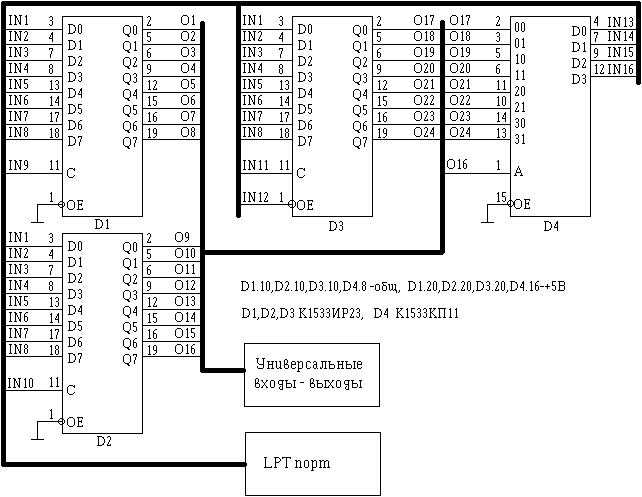 Идея использовать параллельный порт для выдачи и приема цифровых сигналов с ТТЛ уровнями не нова, например в [1] приводится подобная схема. Предлагаемый здесь адаптер отличается простотой, при возможностях достаточных для большого количества применений. К тому же если Вам через какое то время понадобится увеличить количество входов-выходов можно просто собрать такую же схему и подключить ее по приведенной ниже таблице. Хотя если предполагается что выводов одной схемы сразу будет недостаточно лучше использовать более мощный вариант. Схема состоит из трех регистров и одного мультиплексора. Все регистры включены по одинаковой схеме, за исключением третьего, его выходы могут быть переведены в высокоомное состояние, поэтому к нему так же подведен управляющий сигнал разрешения включения выходов ОЕ. Информационные входы всех регистров объединены и подключены к соответствующим выходам параллельного порта компьютера, так как используется ТТЛШ серия, то допустимо нагружать один выход порта на несколько входов микросхем. Для стробирования используются управляющие линии порта, подключенные ко входам С регистров. Для увеличения количества входов используется мультиплексор D4.