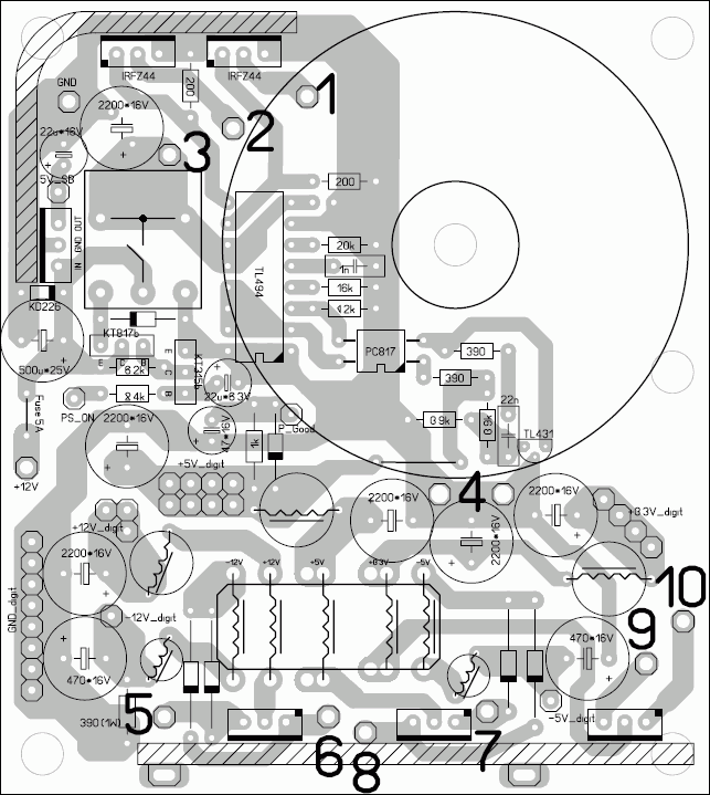 Конструктивно Б/П выполнен на односторонней печатной плате размером 85?95мм, вид со стороны деталей приведен на рис. 2.