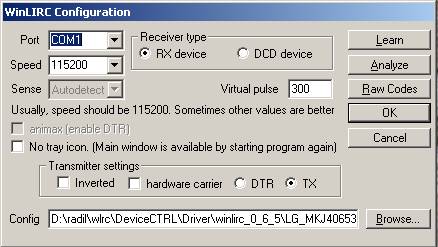 (Все зависит от того, на какую ногу Вы приделали приемник, или в каком положении переключатель.) Для проверки собранной схемы, необходимо в строке Config выбрать временно файл sample.cf, который лежит в папке winlirc-0.6.5 путем нажатия на кнопку Browse...Далее нажать кнопку Raw Codes, откроется окно проверки приема сигнала. Нажимая кнопки на любом ПДУ в окне должны приниматься пакеты типа "Pulse:300, space:4000", если ничего не происходит, нужно проверить правильность собранной схемы ИК приемника, правильно ли выбраны параметры и верно ли указан номер COM порта. Если пакеты принимаются, то собранную схему можно считать верной. Закрываем окно и возвращаемся в окно настройки программы. После этого необходимо указать драйверу Winlirc, с какой моделью ПДУ он будет работать, для этого нужно в строке config выбрать файл ПДУ, нажав на кнопку Browser... и нажать кнопку ОК в окне настройки. Файл на свой ПДУ вы можете получить, скачав его с сайта разработчика драйвера Winlirc lirc.sourceforge.net/remotes/ или направив запрос на бесплатное получение по адресу DeviceCTRL@Mail.ru с пометкой "файл пульта" (укажите модель ПДУ). Все, winlirc настроен! Нажмите Hide Winlirc и программа свернется в трей. Нажмите кнопку ПДУ и Winlirc начнет реагировать на нажатие только выбранного ПДУ, о чем будет сигнализировать миганием в трее круглого значка. Если файла ПДУ Вы не нашли на свою модель, либо Вы не знаете модель или по другим причинам не можете выбрать файл ПДУ, то можно создать его (обучить Winlirc любому ПДУ). Для обучения Winlirc в строке config укажите вручную путь и имя нового файла, в который будет записываться результат обучения, например так: Нажмите Learn (обучение) - появится окно, для обучения Winlirc. Для начала программа попросит ввести имя ПДУ - Please enter a name for this remote. Введите произвольное имя ПДУ и не используйте при вводе ПРОБЕЛЫ ! Далее Winlirc попросит ввести процент распознования (от 1% до 99%) Desired margin of error for this remote? (1-99, enter=25). Чем больше процент, тем более суровее Winlirc будет распозновать в будущем принятый сигнал (если выбрать 99%, то Winlirc скорее всего не будет реагировать на сигнал от ПДУ, так как сигналы у ПДУ не стабильные и не идеально одинаковые), чем меньше будет параметр, тем Winlirc будет относиться более лояльно к принятым сигналам (если выбрать 1%, то Winlirc будет реагировать на ПДУ, но может путать кнопки и реагировать на помехи). Экспериментальные исследования показали, что оптимально вводить 40%. Вводим и нажимаем enter, потом Winlirc напишет Gap and length? ничего не пишем в строке и нажимаем enter. Далее программа попросит нажать одну и ту же любую кнопку необходимое количество раз, для того, чтобы провести анализ типа передаваемого сигнала от ПДУ. Нажимайте и отпускайте до тех пор пока Winlirc не напишет: To finish recording buttons, enter a blank button name. Button 1 name? Winlirc готов к вводу имени кнопки. Далее необходимо внести все данные кнопок ПДУ. Для этого Вы вводите имя кнопки (НЕ ИСПОЛЬЗУЙТЕ ПРОБЕЛЫ!), нажимаете enter после этого Winlirc потребует нажать и не отпускать кнопку, имя которой вы ввели Please press and hold down the 'ВВЕДЕНОЕ_ВАМИ_ИМЯ_КНОПКИ' button until told to stop. Во время нажатия на ПДУ кнопки Winlirc будет принимать данные от ПДУ, о чем будет свидетельствовать увеличение значения "matches= " Держите кнопку нажатой до тех пор, пока Winlirc не предложит сохранить кнопку. (Совет: не держите кнопку, а очень быстро тыкайте ее. )Вы можете отказаться от этого в случае, если очень много ошибок (количество ошибок отображено в з