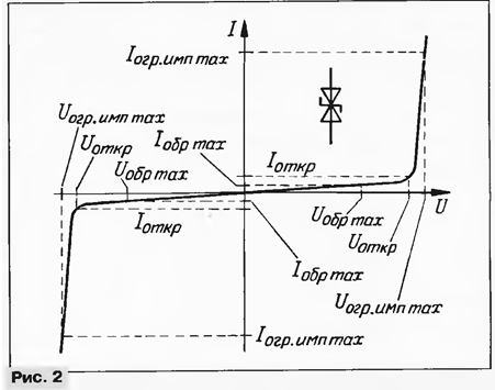 Для ограничения импульсов обоих знаков удобно два ограничителя включить встречно-последовательно. ВАХ такой пары симметрична (рис. 2).