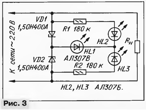 По значениям указанных характеристик потребитель может выбрать ограничитель напряжения, необходимый для защиты радиоэлектронной аппаратуры. Симметричный (двуплечий) ограничитель включают в сеть переменного тока параллельно полезной нагрузке. В нормальном режиме сети оба его плеча закрыты и через него протекает лишь очень малый обратный ток при обоих полу периодах. Иначе говоря, ограничитель ничем себя не обнаруживает, потребляя некоторую - очень малую - мощность (сотые доли ватта). Как только в сети появится высоковольтный импульс напряжения, превышающий Uоткp ограничителя, откроются оба его плеча, одно - в прямом направлении, другое - в обратном. В результате импульс будет блокирован, а на нагрузке в этот момент напряжение не превысит Uогр. Следует заметить, что значение Римп mах зависит от длительности хи гасимого импульса и в пределах τи = 0,1...10мc приблизительно пропорционально отношению 1/τи. При увеличении температуры окружающей среды Токр. ср от 40 до 100СС рассеиваемую мощность Римп max необходимо уменьшать прмерно пропорционально 0,024 Токр. ср. Для снижения амплитуды высоковольтных импульсов на пути от сети 220 В до выводов питания микросхем наиболее целесообразно включать ограничители в состав блока питания [2]. Если в питающей сети появятся импульсы, энергия которых будет больше допустимой для примененного ограничителя, он, как и стабилитрон при слишком большом токе стабилизации, перегреется и выйдет из строя. С этого момента аппаратура, включенная в сеть, окажется незащищенной. Поэтому существенным недостатком применения ограничителей считают отсутствие информации об их работоспособности или выходе из строя после воздействия мощных импульсов. Чтобы обеспечить индикацию исправного состояния симметричного ограничителя, его составляют из двух одиночных и подключают к нему цепь из трех с вето-диодов и двух токоограничивающих резисторов (рис. 3).