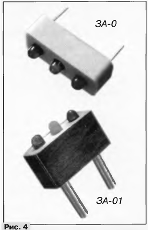 Особенность работы индикатора исправности - использование светодиодов в нестандартном режиме. При исправных ограничителях VD1 и VD2 и положительном полупериоде напряжения сети (плюс - на верхнем по схеме сетевом проводе) ток беспрепятственно протекает через ограничитель VD1, открытый в прямом направлении, и через светодиод HL1. Ограничитель VD2 в это время закрыт. В результате почти все сетевое напряжение оказывается приложенным к цепи HL3R2, причем к с вето диоду - в обратном направлении. Поэтому све-тодиод HL3 открывается в обратном направлении*; ток через него ограничивает резистор R2. Таким образом, через всю цепь от плюсового провода до минусового протекает ток около 2 мА. Этого достаточно, чтобы обеспечить заметное свечение "зеленого" светодиода HL1. Светодиод HL2 не светит, так как к цепи HL2R1 приложено слишком малое напряжение (менее 3 В). При смене полярности напряжения сети происходят те же процессы, только меняются местами VD1 и VD2, R2 и R1, HL3 и HL2. То есть исправность ограничителей подтверждает зеленый сигнал индикатора. В ряде случаев описанный индикатор может одновременно служить индикатором наличия сетевого напряжения. Легко видеть, что при выходе из строя (обрыве) ограничителя VD1 гаснет "зеленый" светодиод HL1 и включается "красный" светодиод HL2, а при порче ограничителя VD2 - "красный" HL3. Описанный модуль, получивший наименование ЗА-0, разработан в ОАО "Вычислительная техника и промышленная электроника" (г. Москва) совместно с НПК "Кварк" (г. Ташкент) и освоен в серийном производстве. Внешний вид модуля представлен на фото (рис. 4).