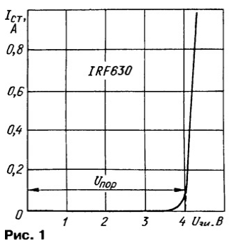 Энциклопедия радиоэлектроники и электротехники / Радиолюбителю-конструктору Как известно, применение в импульсных преобразователях напряжения мощных полевых транзисторов вместо биполярных дает ряд преимуществ. Об этом можно прочитать в специальной литературе, однако, во-первых, она практически недоступна рядовому читателю и, во-вторых, вопросы управления мощными полевыми транзисторами изложены в ней, как правило, в общем виде, без привязки к конкретным схемам, детальное описание работы преобразователей отсутствует. Автор этой статьи знакомит с особенностями использования полевых транзисторов в подобных устройствах. Наибольшее распространение в импульсных преобразователях напряжения получили полевые транзисторы структуры МДП с индуцируемым n-каналом. При нулевом напряжении на затворе (по отношению к истоку) транзистор закрыт и открывается плюсовым напряжением с довольно четко выраженным порогом. На рис. 1 изображена экспериментально снятая зависимость тока стока от напряжения затвор-исток транзистора IRF630. Интервал входного напряжения от полностью закрытого состояния до насыщенного не превышает 0,5 В, а это значит, что транзистор - типично переключательный.