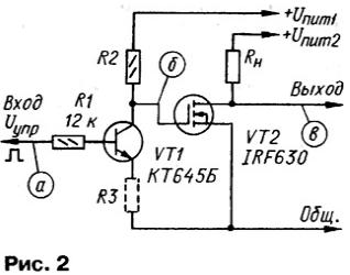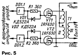 Включение полевого транзистора по схеме рис. 2 имеет одну интересную особенность, способствующую решению поставленной задачи. Скорость нарастания тока стока в начальной фазе импульса заметно снижается, следствием чего является полное отсутствие выброса на фронте импульса тока стока (о форме импульса тока стока можно судить по форме импульса напряжения в точке в) Время открывания мощного полевого транзистора примерно такое же, что и биполярного, включенного по соответствующей схеме, а время закрывания - раз в десять меньше. Так, для транзистора IRF630 при Uпит1 = 15 В и R2 = 560 Ом tоткр = 0,5 мкс, tзакр = 0,06 МКС. При такой ВЫСОКОЙ СКОРОСТИ закрывания спад импульса напряжения на стоке имеет выброс, равный 7,5 В при Uпит = 20 В. Амплитуда импульса также равна 20 В, значит, выброс равен 27,5 % от его амплитуды. Некоторые считают выброс следствием прямого прохождения входного сигнала через емкость Ссэ. Полагаю, что мощность входного сигнала слишком мала для этого, хотя условия для прохождения, конечно, есть. Более вероятной причиной я считаю реакцию цепи питания транзисторов на быстрое уменьшение тока стока. В любом случае с этим явлением приходится бороться. Проще всего - уменьшить выброс увеличением времени разрядки входной емкости транзистора VT2 (см. рис. 2). Для этого в эмиттерную цепь транзистора VT1 был включен резистор R3, При R3 = 56 Ом амплитуда выброса уменьшилась до 1,75 В или 9 %, а при R3 = 75 Ом - до 1 В или 5 % от амплитуды импульса. С резистором R3 длительность фронта импульса увеличивается незначительно - примерно на 0,1 мкс. Совершенно неискаженными импульсы получаются, если к верхнему по схеме выводу сопротивления нагрузки Rн подключить цепь из последовательно включенных конденсатора емкостью 0,47... 1 мкФ и резистора сопротивлением 1...2 Ом (второй конец цепи - к общему проводу). Эту цепь надо разместить возможно ближе к выводам транзистора VT2. В двухтактных преобразователях, кроме перечисленных, появляется еще одна проблема - сквозной ток. Причина его появления в устройствах на биполярных транзисторах состоит в конечном времени рассасывания избыточных неосновных носителей в базе транзисторов, из-за чего приходится искусственно задерживать открывание транзисторов У полевых транзисторов в этих условиях задержка включения и выключения происходит автоматически и длительность задержек стабильна. Несмотря на то что накопление заряда у полевых транзисторов отсутствует, сквозной ток может появиться, только когда tзад2 > tзад1. Если обеспечить закрывание транзистора в одном плече преобразователя раньше, чем откроется закрытый в другом плече, этого тока не будет. Иначе говоря, между закрыванием одного транзистора и открыванием другого должна быть пауза. Для открывания полевого транзистора требуется сравнительно небольшая мощность. Управляющие импульсы можно подавать напрямую с выходов логических микросхем без предварительного усиления тока. Выходная мощность самого преобразователя может достигать при этом нескольких сотен ватт. Для управления мощными полевыми транзисторами промышленность выпускает специальные микросхемы, которые допускают на выходе ток до 100 мА и больше. Но это микросхемы универсальные, рассчитанные на управление транзисторами с Свх = 3000...4000 пФ и на частоту преобразования в сотни килогерц. Фрагмент схемы включения транзисторов с уп