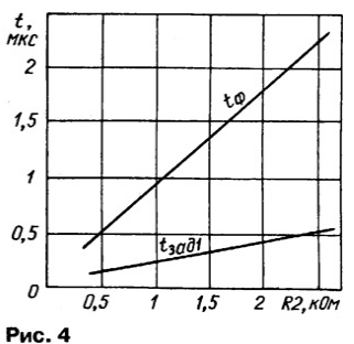 До момента плюсовое напряжение на входе поддерживает транзистор VT1 открытым. Длительность фронта и спада запускающих импульсов (в сумме со временем нарастания усилителя осциллографа) не превышала 20 не, поэтому на диаграмме они не отражены. На отрезке t1...t2, когда транзистор VT1 уже закрыт, VT2 тоже еще закрыт и напряжение на его затворе увеличивается по экспоненте с постоянной времени R2Cзи. На экране этот начальный участок выглядит как отрезок прямой линии. Транзистор VT2 открывается в момент t2, т. е. с некоторой задержкой. Обозначим ее как tзад1 = t2 - t1. С момента t2 начинает действовать отрицательная ОС между стоком и затвором через емкость Ссз (эффект Миллера). Напряжение на затворе перестает увеличиваться, и график б на участке t2...t3 представляет собой на экране горизонтальную прямую. Зато напряжение в точке в с момента t2 начинает уменьшаться из-за увеличения тока стока. В момент t3 транзистор VT2 открывается полностью, напряжение на его стоке почти достигает нуля и остается постоянным, отрицательная ОС через Ссэ выключается (ток ОС равен нулю). Напряжение на затворе снова начинает увеличиваться по экспоненте до Uпит1. В момент t4 открывается транзистор VT1 и начинает разряжаться емкость Сзи. Постоянная времени ее разрядки намного меньше, чем зарядки, поэтому напряжение на затворе транзистора VT2 уменьшается очень быстро, и пока оно не достигнет значения Unop (момент t5), транзистор VT2 остается открытым. В момент t5 он начинает закрываться, напряжение на его стоке начинает увеличиваться и снова вступает в действие отрицательная ОС. На графике б появляется ступенька, но так как закрывание происходит очень быстро, ее длительность очень мала. Транзистор закрывается раньше, чем напряжение на его затворе спадает до нуля. Интервал времени от U до t5 представляет собой время задержки выключения tзад2 = t5 -t4. Одно из важнейших условий надежной работы импульсных преобразователей напряжения - формирование безопасного режима переключения мощных транзисторов. При открывании транзистора ток стока увеличивается от нуля до максимума, а напряжение на нем уменьшается от максимума почти до нуля. Когда транзистор закрывается, идет обратный процесс. Необходимо, чтобы и ток, и напряжение, и их произведение на всем протяжении траектории рабочей точки не превышали допустимых значений. Должны быть исключены или сведены к минимуму выбросы тока и напряжения в переходных положениях. Этих целей достигают принудительным замедлением процессов переключения транзисторов. В то же время фронт и спад импульса должны быть как можно короче, чтобы уменьшить выделение тепла в транзисторе, т. е. требуется найти компромисс. Эксперименты показывают, что с полевыми транзисторами задача решается легче, чем с биполярными. Длительность фронта импульса тока стока равна длительности горизонтального участка t2...t3, которая, в свою очередь, пропорциональна сопротивлению резистора R2 (см. рис. 2). Зависимость длительности фронта tф, от сопротивления резистора R2 изображена на рис. 4. Следовательно, подбирая этот резистор, можно легко установить нужную скорость нарастания тока стока.
