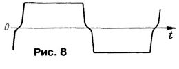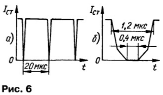 На рис. 6 изображены в разных временных масштабах импульсы тока стока транзисторов VT1 и VT2. Сигнал на экране осциллографа выглядит, как прямая линия с узкими зубцами (рис. 6,а). Зубцы - это короткие паузы между импульсами тока стока. Форма паузы в крупном временном масштабе показана на рис. 6,б. Сигнал можно наблюдать на экране двуканального осциллографа в режиме "сумма" с инверсией в одном из каналов.