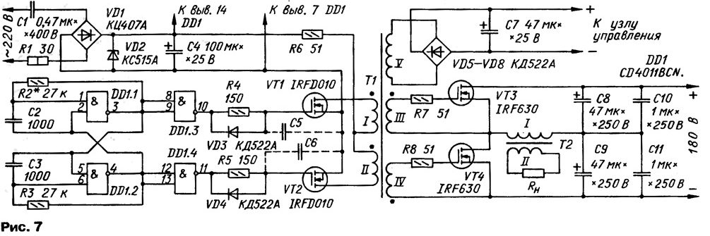 Однако схема на рис. 5 нетипична для построения мощных импульсных блоков питания. В них чаще всего используют полумостовые преобразователи напряжения, в которых цепи управления мощными транзисторами должны быть изолированы одна от другой по постоянному току. Схема полумостового преобразователя (в упрощенном виде - без некоторых вспомогательных узлов) показана на рис. 7. Устройство по схеме рис. 5 использовано здесь в качестве генератора управляющих импульсов и дополнительного источника питания. Этот преобразователь работает на частоте 25 кГц; выходная мощность - 200 Вт. Задающий генератор на логических элементах DD1.1, DD1.2 микросхемы CD4011BCN работает очень стабильно. С другой микросхемой частота может отличаться от указанной, тогда резисторы R2 (и, возможно, R3) придется подбирать. Использовать микросхему К561ЛА7 нежелательно, поскольку напряжение питания задающего генератора равно 15 В, т. е. предельно допустимое для этой микросхемы. Транзисторы IRFD010 имеют небольшую входную емкость, отчего паузы между импульсами не превышают 0,5 мкс. Длительность пауз можно увеличить, подключив конденсаторы С5 и С6 (показано штриховыми линиями) емкостью от 100 пф и более. Ими можно симметрировать паузы. Если паузы симметричны, то расширить их можно проще, включив конденсатор между затворами транзисторов VT1 и VT2. При этом длительность фронта и спада импульсов увеличивается незначительно. Симметричности самих импульсов добиваются подборкой резистора R2. У описываемого преобразователя длительность паузы у основания импульсов равна 0,1 мкс и примерно 0,45 мкс между их вершинами. Импульсы, поступающие с обмоток III и IV трансформатора Т1, открывают мощные транзисторы VT3 и VT4. Такое включение транзисторов эквивалентно показанному на схеме рис. 2 с резистором R3 Форму импульсов на первичной обмотке трансформатора Т2 в произвольном масштабе иллюстрирует рис. 8.