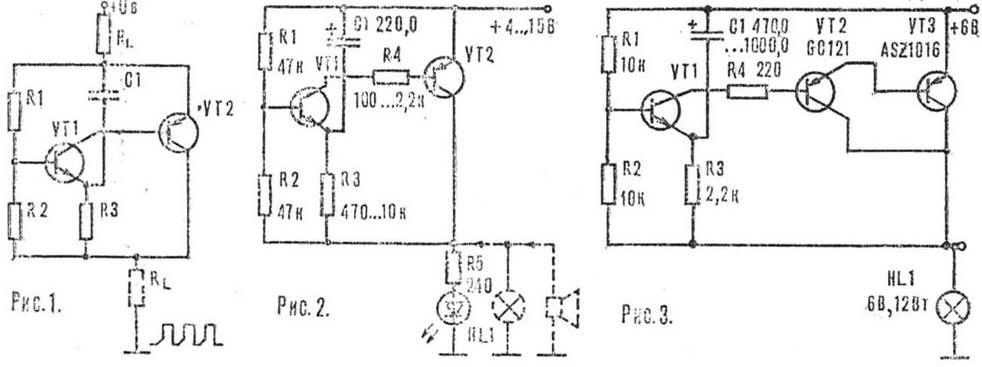 ìîìåíò âêëþ÷åíèÿ êîíäåíñàòîð Ñ1 (ðèñ. 1) ðàçðÿæåí. Íàïðÿæåíèå íà ýìèòòåðå òðàíçèñòîðà VT1 áîëüøå ïî âåëè÷èíå, ÷åì íà áàçå.  ïðîöåññå çàðÿäêè Ñ1 ïîòåíöèàë íà ýìèòòåðå VT1 ñíèæàåòñÿ è, êîãäà îí ñòàíåò íèæå ïîòåíöèàëà áàçû ïðèáëèçèòåëüíî íà 0,6 Â, ýòîò òðàíçèñòîð îòêðûâàåòñÿ, âûçûâàÿ îòïèðàíèå ïîëóïðîâîäíèêîâîãî òðèîäà VÒ2. ×åðåç íåãî ïðîòåêàåò òîê, çàâèñÿùèé îò âåëè÷èíû íàãðóçêè. Êîíäåíñàòîð Ñ1 ðàçðÿæàåòñÿ ÷åðåç VÒ1, VÒ2 è R3. Ïîñëå åãî ðàçðÿäà òðàíçèñòîðû çàïèðàþòñÿ è ïðîöåññ ïîâòîðÿåòñÿ. ×àñòîòó êîëåáàíèé îïðåäåëÿþò âåëè÷èíû Ñ1 è R3. Ïóòåì èçìåíåíèÿ ñîïðîòèâëåíèÿ R3 âàðüèðóþò ñîîòíîøåíèå äëèòåëüíîñòè âêëþ÷åííîãî ñîñòîÿíèÿ ê âûêëþ÷åííîìó â èíòåðâàëå îò 1:1 äî 1:100.